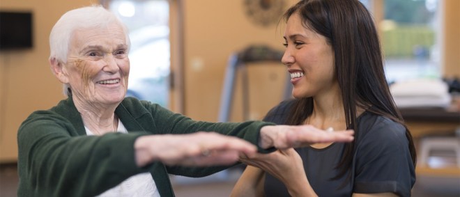 A senior woman works with her occupational therapist